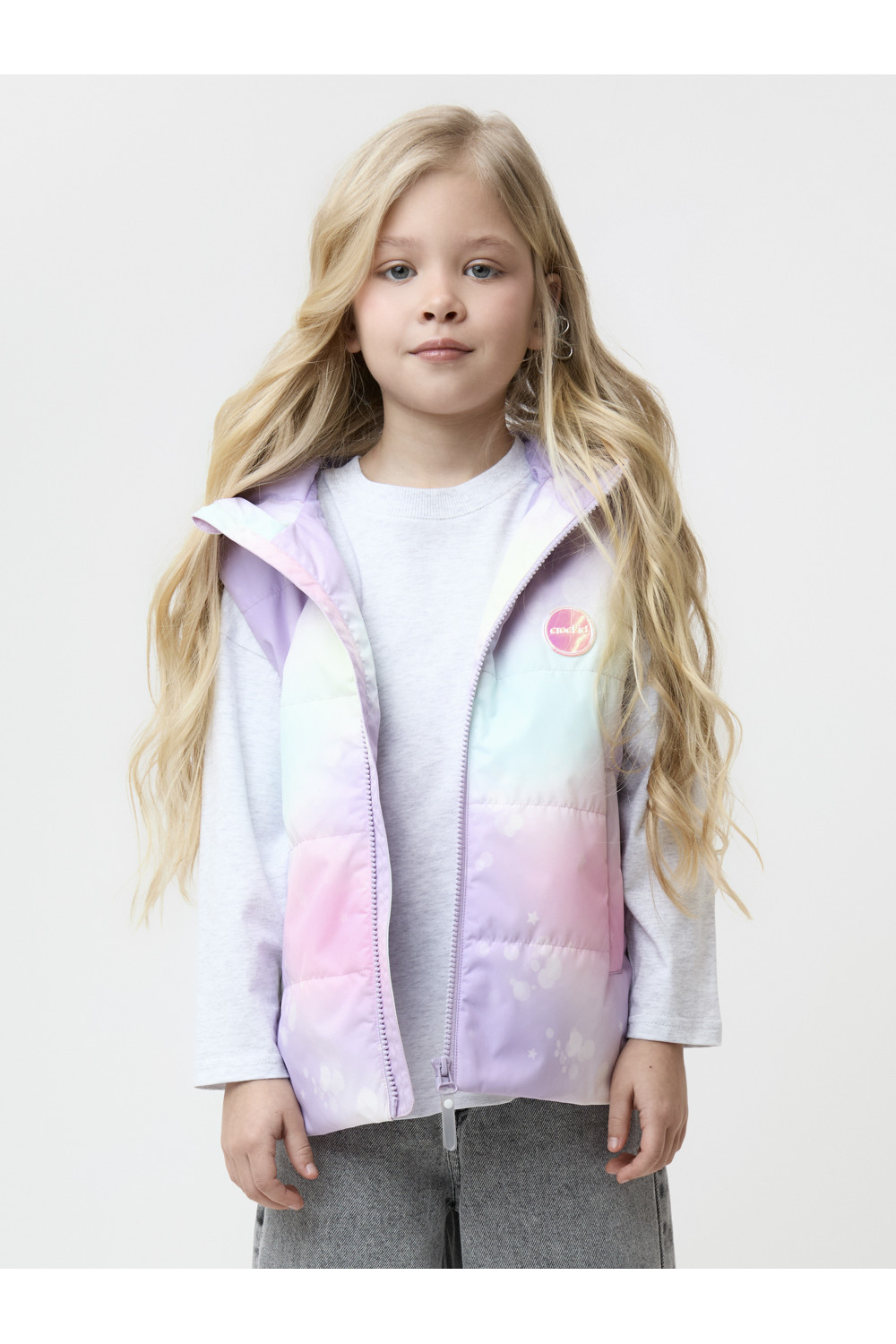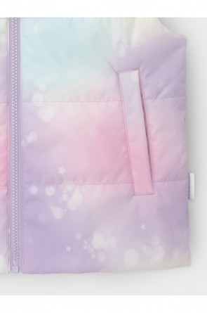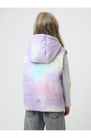 Стёганый жилет с капюшоном для девочки с утеплителем Fellex®, 120 г/м2. Выполнен из мембранной ткани с дополнительной тефлоновой обработкой. Данный вид обработки предохраняет изделие от загрязнения и лучше отводит влагу. Подклад из 100% полиэстера. Капюшон не снимается. Изделие застёгивается на молнию, предусмотрена защита подбородка. Два кармана по бокам без застёжек. Во всех изделиях верхнего ассортимента для безопасности ребёнка предусмотрены светоотражающие элементы.