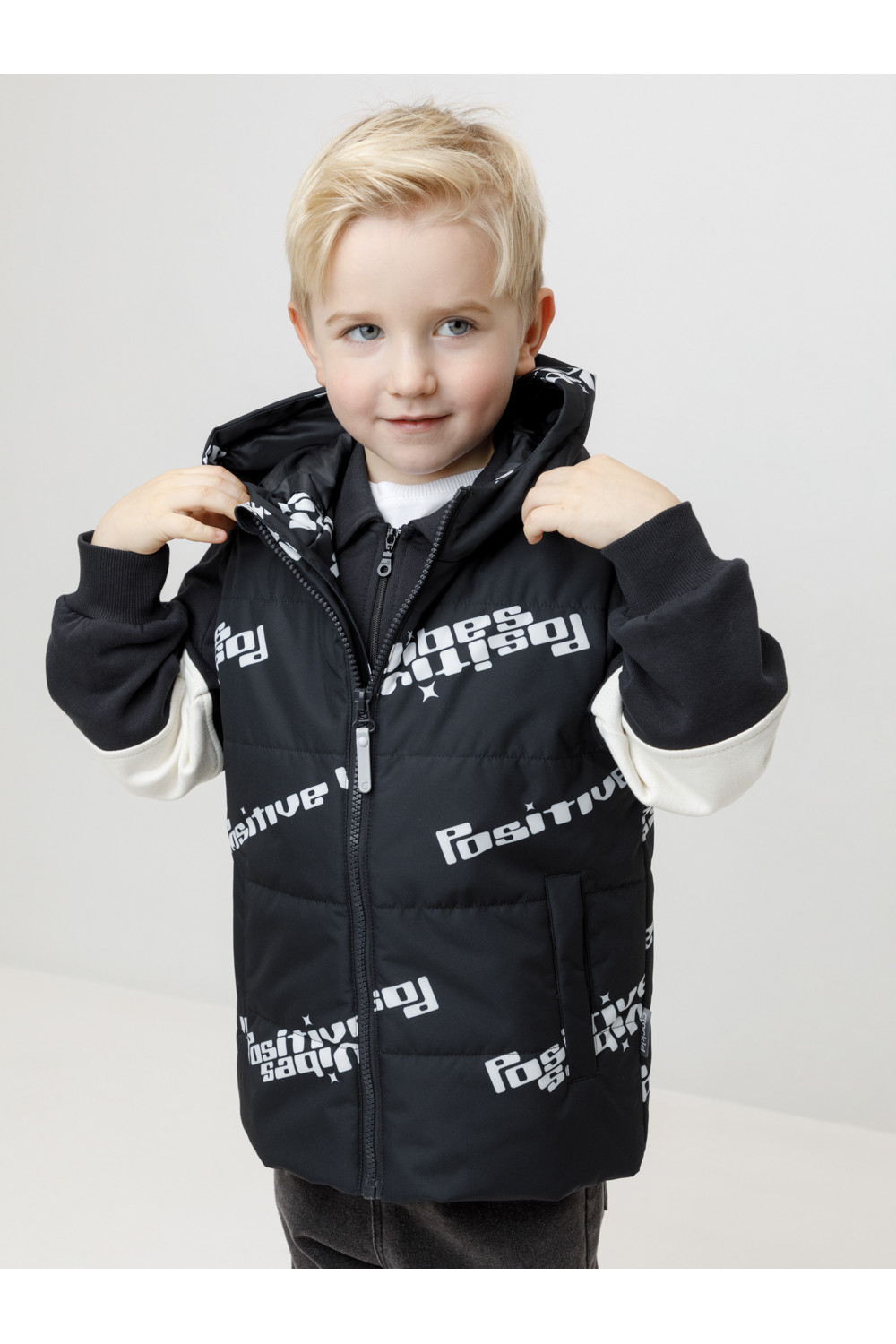 Стёганый жилет с капюшоном для мальчика с утеплителем Fellex®, 120 г/м2. Выполнен из мембранной ткани с дополнительной тефлоновой обработкой. Данный вид обработки предохраняет изделие от загрязнения и лучше отводит влагу. Подклад из 100% полиэстра. Капюшон не снимается. Изделие застёгивается на молнию, предусмотрена защита подбородка. Два кармана без застёжек. Во всех изделиях верхнего ассортимента для безопасности ребёнка предусмотрены светоотражающие элементы.