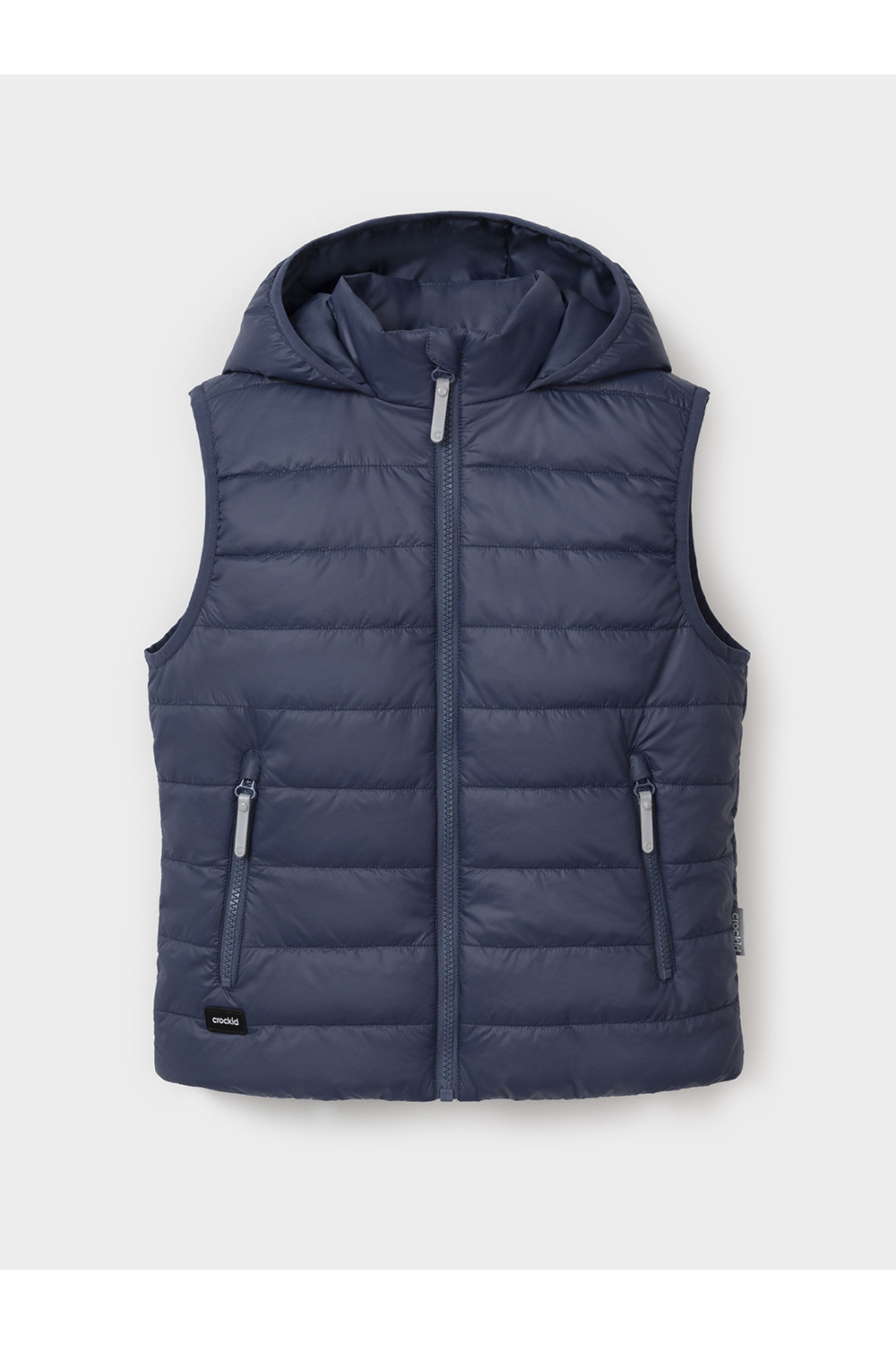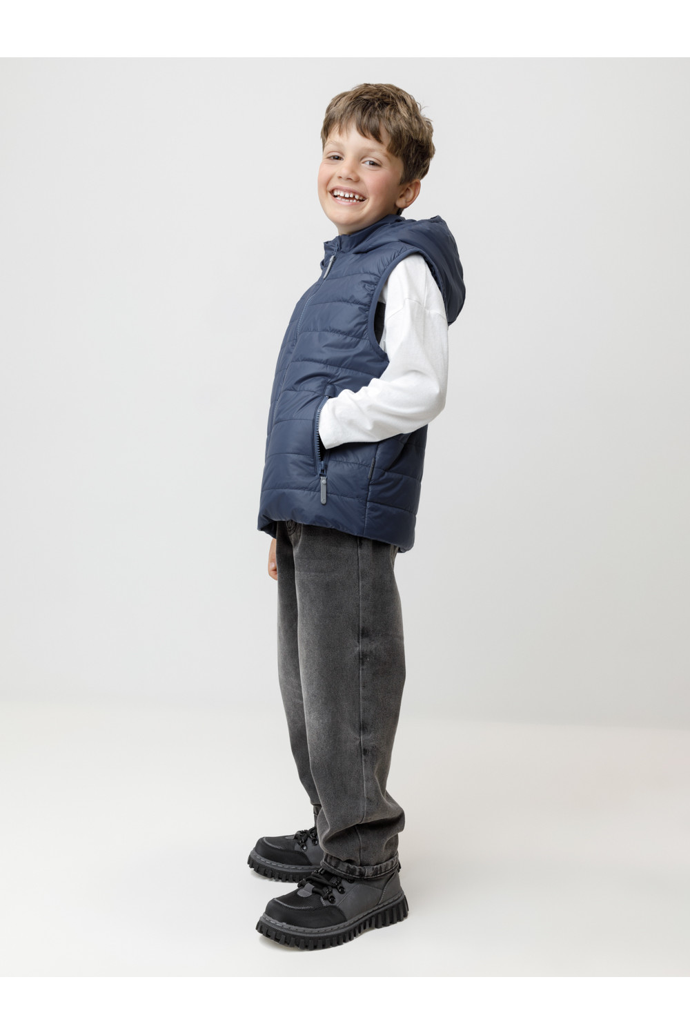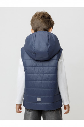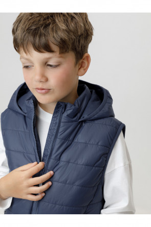 Стёганый жилет с капюшоном для мальчика с утеплителем Fellex®, 120 г/м2. Выполнен из мембранной ткани с дополнительной тефлоновой обработкой. Данный вид обработки предохраняет изделие от загрязнения и лучше отводит влагу. Подклад из хлопка в размерах 86-92 и 92-98 и из полиэстера в размерах от 98-104 до 122-128. Капюшон не снимается. По краю капюшона и проймам обработка эластичным кантом для лучшего прилегания. Изделие застёгивается на молнию, предусмотрена защита подбородка. Два кармана по бокам на молниях. Во всех изделиях верхнего ассортимента для безопасности ребёнка предусмотрены светоотражающие элементы.