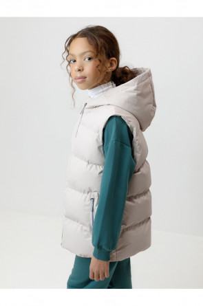 Стёганый жилет с капюшоном для девочки с утеплителем, 120 г/м2. Выполнен из мембранной ткани с дополнительной тефлоновой обработкой. Данный вид обработки предохраняет изделие от загрязнения и лучше отводит влагу. Подклад из 100% полиэстра. Капюшон не снимается. Изделие застёгивается на молнию, предусмотрена защита подбородка. Два кармана по бокам застёгиваются на молнии. Во всех изделиях верхнего ассортимента для безопасности ребёнка предусмотрены светоотражающие элементы.