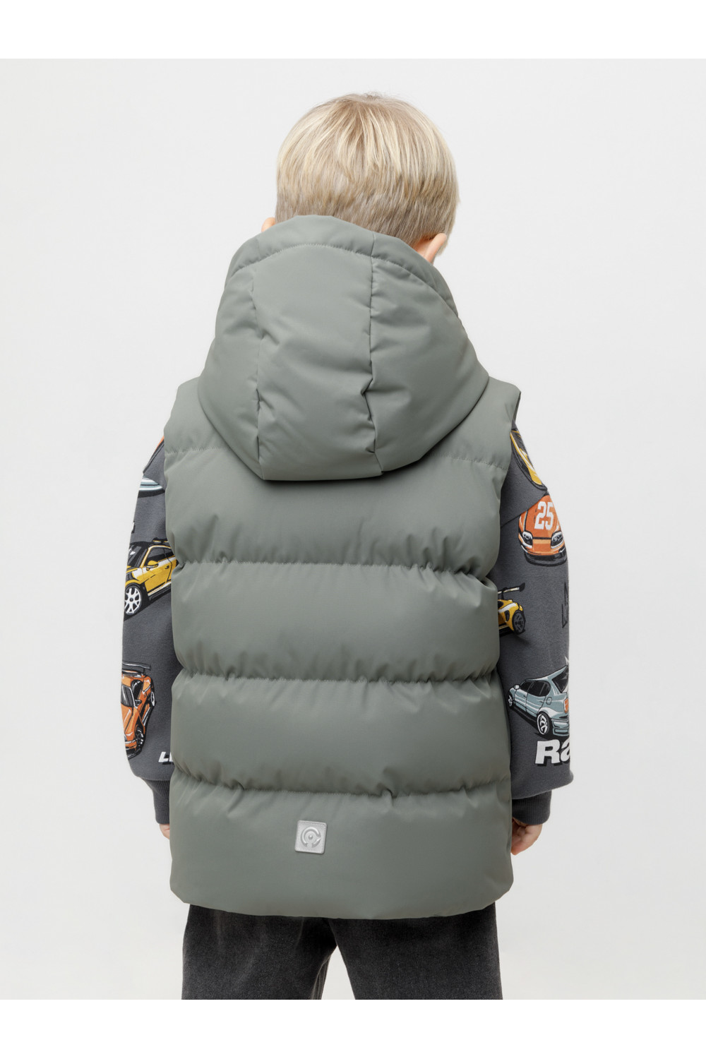 Стёганый жилет с капюшоном для мальчика с утеплителем синтепух, 120 г/м2. Выполнен из мембранной ткани с дополнительной тефлоновой обработкой. Данный вид обработки предохраняет изделие от загрязнения и лучше отводит влагу. Подклад из 100% полиэстра. Капюшон не снимается. Изделие застёгивается на молнию, предусмотрена защита подбородка. Два кармана по бокам застёгиваются на молнии. Во всех изделиях верхнего ассортимента для безопасности ребёнка предусмотрены светоотражающие элементы.