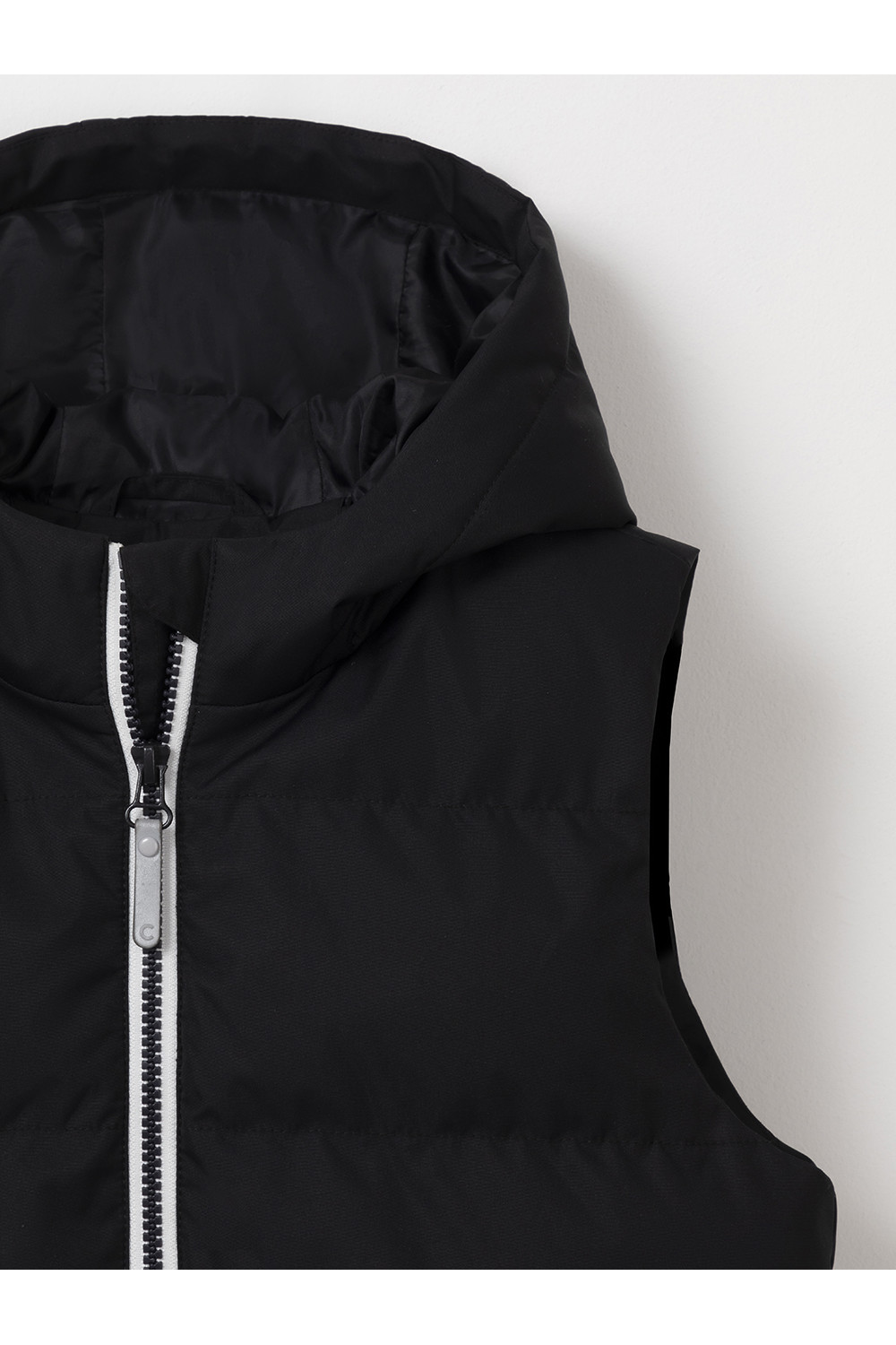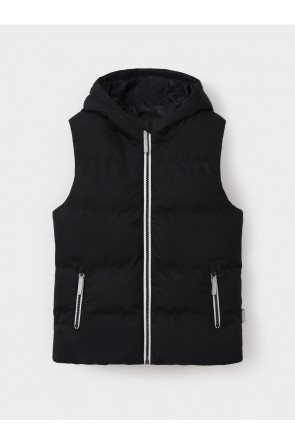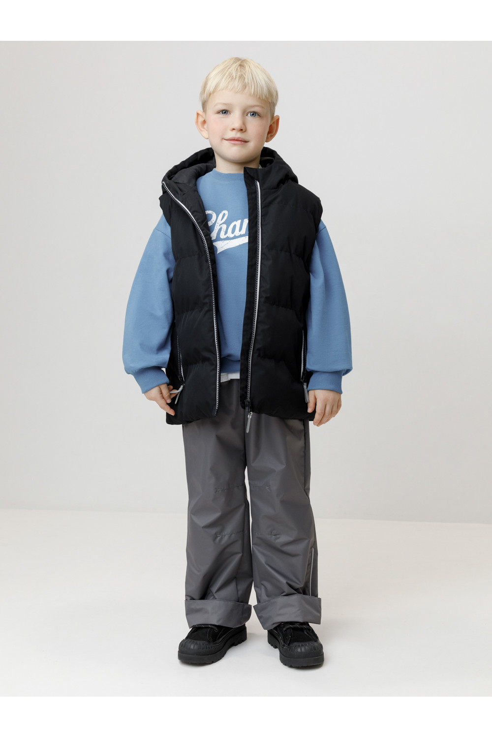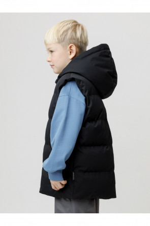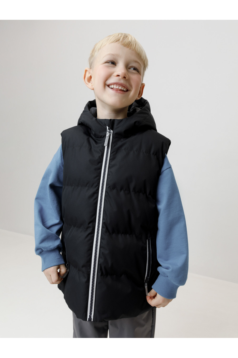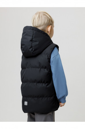 Стёганый жилет с капюшоном для мальчика с утеплителем синтепух, 120 г/м2. Выполнен из мембранной ткани с дополнительной тефлоновой обработкой. Данный вид обработки предохраняет изделие от загрязнения и лучше отводит влагу. Подклад из 100% полиэстра. Капюшон не снимается. Изделие застёгивается на молнию, предусмотрена защита подбородка. Два кармана по бокам застёгиваются на молнии. Во всех изделиях верхнего ассортимента для безопасности ребёнка предусмотрены светоотражающие элементы.